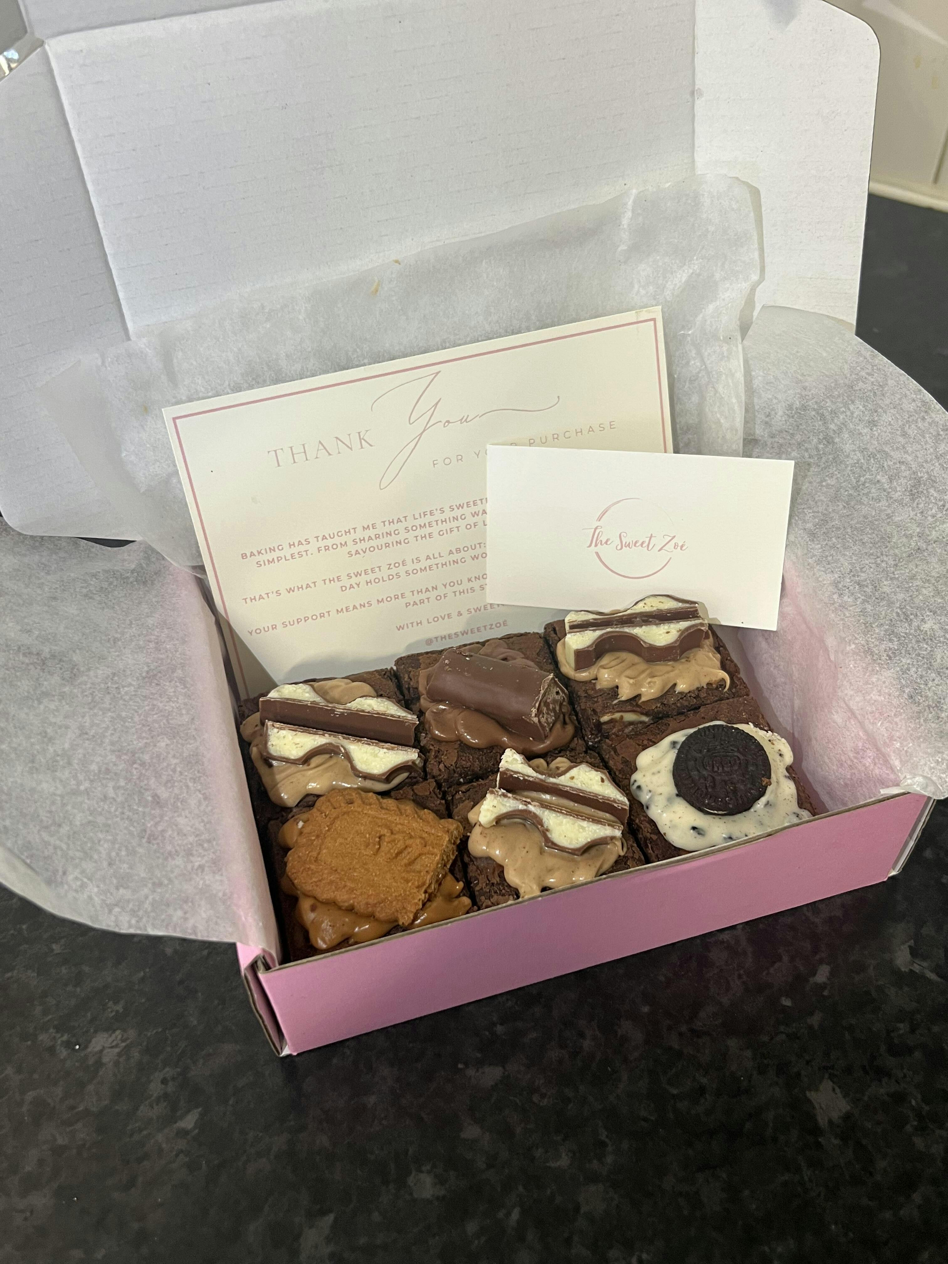 Freshly baked fudgy brownies, packed with rich chocolate and topped with your favourite flavours. Each box is carefully packaged and delivered straight to your door (or available for local pickup in Swindon).